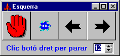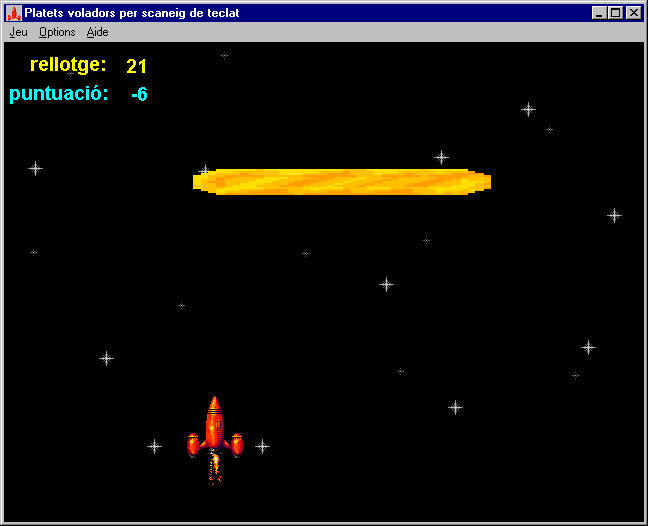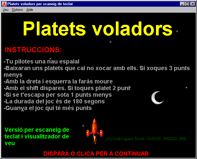 El funcionament és el següent, si el coet està parat, la rata (cursor), va passant damunt les tecles: disparar, esquerra i dreta. Quan cliquem a esquerra o dreta el cursor va damunt de la tecla parar i es queda fix. Quant vulguem disparar, o canviar de sentit, primer haurem de prémer la tecla parar, i a continuació tornarà a començar l'escaneig i podrem clicar on convingui. Proveu-ho, és molt senzill. Si volem parar el procés cliquem el botó dret de la rata. Hi ha un quadre on podem escollir la velocitat d'escaneig. Per defecte hi ha un 12 que vol dir que el cursor s'està quiet 12 dècimes de segon damunt cada tecla. Aquesta és una velocitat comprovada que va bé, però si l'usuari té poc control del dispositiu accionador del clic de la rata es pot augmentar aquest valor. Si una persona vol tenir un control més precís del joc es pot disminuir aquest número. I això és tot. Per començar a jugar espereu que la rata passi per damunt la tecla Disparar i cliqueu. I preparats per a disparar. Menú