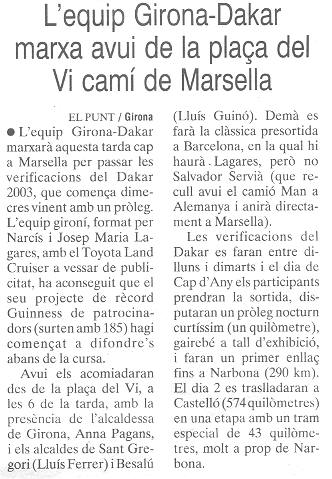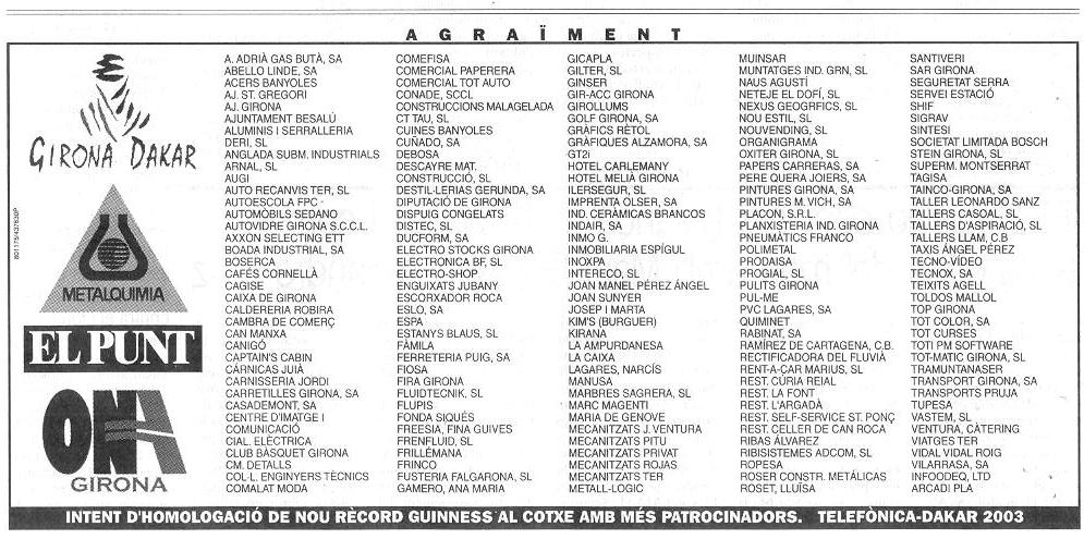 17/11/2001 PUNT-DIARI. Dos gironins projecten disputar el Dakar del 2003 i batre un rècord Guinness amb 150 patrocinadors