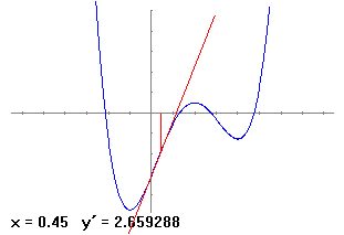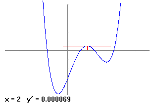 A partir d'aquí podem fer estudis una mica més sofisticats. Diem que en un màxim (o un mínim) la primera derivada s'anul·la. El programa ens ajudarà a entendre que volem dir amb això. Anem a l'opció derivada en un punt, per exemple en el punt 2 i anem veien que passa a la pantalla en els punts a la seva dreta, això ho fem prement els botons corresponents. Observem que en el mínim la recta tangent es posa horitzontal i el valor que dóna de la derivada en el punt és 0. També es va dibuixant la gràfica de la funció derivada i podem explicar perquè en els màxims la segona derivada és negativa (ja que la primera derivada és decreixent i en els mínims la segona derivada és positiva (ja que la primera derivada és creixent).