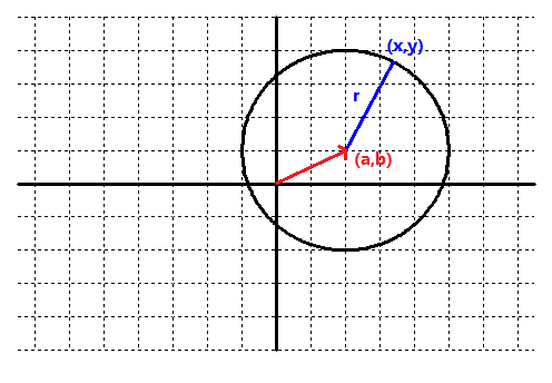 És el lloc geomètric dels punts del pla tals que la distància a un punt anomenat centre `(a,b)` és constant. Aquesta constant en diem `r` (radi). ![]() Distància de `(a,b)` a `(x,y) = sqrt((x-a)^2+(y-b)^2)` `(x-a)^2+(y-b)^2 = r^2` `x^2-2ax+a^2+y^2-2bx+b^2 = r^2` |