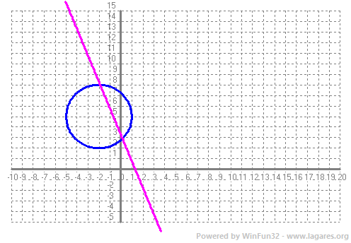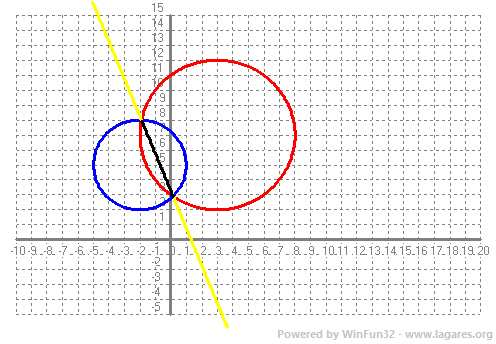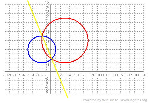 A C' necessitem trobar el radi que és la distància entre els dos punts, `(3,7)-(-2,7)=(5,0)` i ara cal calcular el mòdul, `r=sqrt(5^2+0^2)=5` Per la qual cosa l'equació de C', `x^2+y^2-2·3-2·7+3^2+7^2-5^2 =0 => x^2+y^2-6x-14y+33=0` Per trobar la posició relativa cal que resolem el sistema: `x^2+y^2+4x-10y+20=0` `x^2+y^2-6x-14y+33=0` Restant les dues equacions: `10x+4y-13=0 => y = (13-10x)/4` i ho substituïm a una de les equacions: `x^2+((13-10x)/4)^2-6x-14·(13-10x)/4+33=0` Si ho arreglem l'equació queda: `116x^2+204x-31=0` i les solucions són: `x_1=-51/58-(5sqrt(35))/29 \approx -1'9` i `y_1=(13-10·(-1,9))/4 \approx 8` `x_2=-51/58+(5sqrt(35))/29 \approx 0'14` i `y_2=(13-10·(0'14))/4 \approx 2'9` Tenim dues circumferències secants ja que es tallen en dos punts, `(-1'9,8)` i `(0'14,2'9)` ![]() Recordem que aquest problema es podia fer d'una altra manera. Es podia calcular la distancia entre els dos centres i veure que era menor que la suma dels dos radis, per la qual cosa les dues circumferències es tallen. Això és molt més senzill i infinitament més curt, però com que més endavant necessitem calcular aquests punts d'intersecció, ja tenim la feina feta :-) b-Calcula l'eix radical. SOLUCIÓ:
