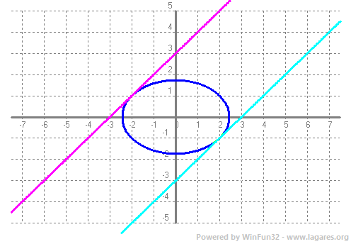 `(4m)^2-12·(2m^2-6)=0` `16m^2-24m^2+72=0` `-8m^2+72=0` `m^2=(-72)/(-8)=9` O sigui les rectes són `y=x+3` i `y=x-3` ![]() |