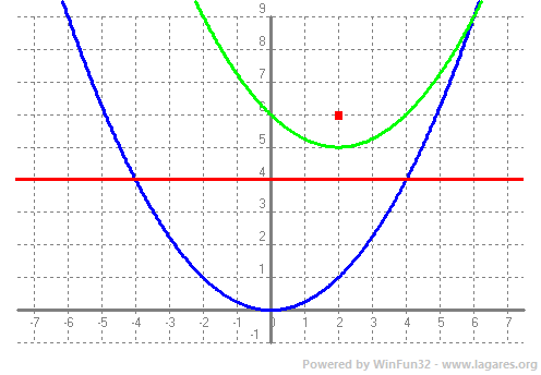 La `y_v=x^2/4-x+6=2^2/4-2+6=5`. Coordenades del vèrtex `(2,5)` L'obertura de la paràbola només ve determinada pel coeficient de la `1/4x^2` que és el mateix que a la paràbola de l'exercici anterior, `1/4`. Per la qual cosa, igual que ala paràbola anterior, el focus es trobarà el vector `(0,1)` per sobre del vèrtex. I la directriu estarà a sota `5-1=4`. Equació dela directriu , `y=4` ![]() La cançó que toca aquí. |
