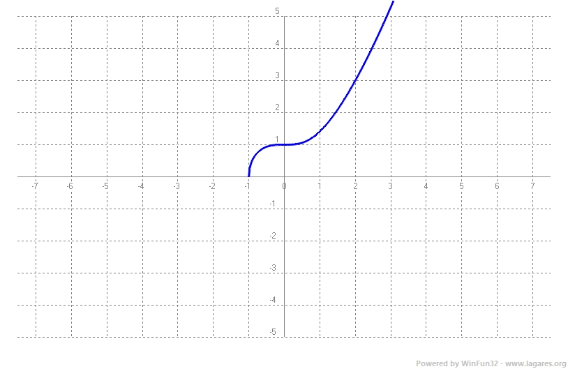 `1+x^3=0` `x^3=-1` `x=\root(3){-1}=-1` Per trobar el punt de tall amb l'eix `y` només cal calcular la imatge de `x=0 => f(0)=\sqrt{1+0^3}=\sqrt{1}=1` b)