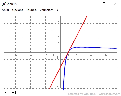 c) Per trobar l'equació de la recta tangent en el punt `x=1` només cal calcular la imatge `f(x)=2ln(1)/1=0` i el pendent de la recta que el podem trobar substituin a la derivada: