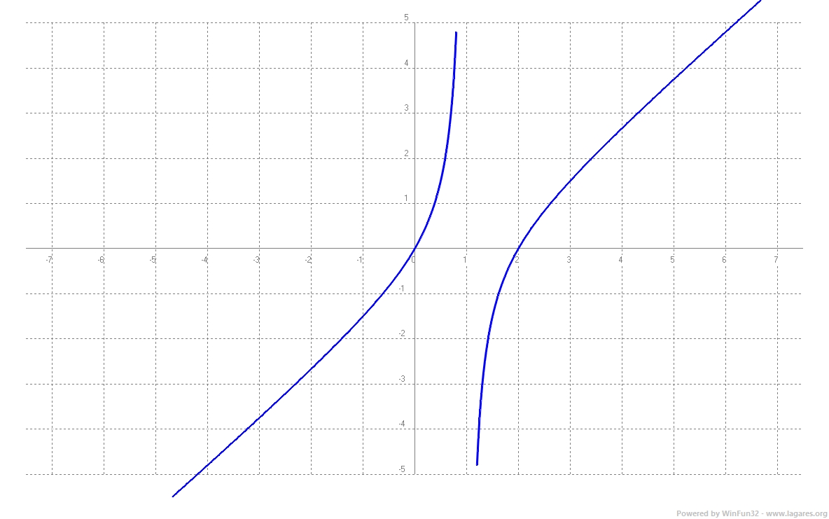 `(x^2-2x)/(x-1)=0` `x^2-2x=0` `(x-2)x=0` Té dues solucions: Per trobar el punt de tall amb l'eix `y` cal substituir `x=0` `f(0)=(0^2-2·0)/(0-1)=0/(-1)=0` Per trobar, si en té, les asímptotes verticals cal trobar algún punt que el seu límit sigui `\infty`. Veiem que el domini són tots els `R` excepte `x=1` ja que el denominador s'anul·la per aquest valor. Això fa que en `x=1` sigui possible que hi hagi una asímptota vertical. Per confirmar-ho cal veure que el límit quan és tendeix a `1` sigui `\infty`. `\lim_{x\to 1}(x^2-2x)/(x-1)= (1-2)/(1-1)=(-1)/0=\infty` En resum tenim una asímptota vertical d'equació `x=1` (recordem que les equacions de les rectes verticals són de la forma `x=a`. Per trobar, si en té, les asímptotes horitzontals cal calcular el l´mit quan `x-> \infty` i si dona un número tením asímptota horitzontal. Si el calculem veiem que la funció és un quocient de dos polinomis amb grau més gran a dalt que a baix i això tendeix a `\infty` per la qual cosa, no té símptotes horitzontals. Doncs ara mirarem si té asímptotes oblíqües. Per fer-ho cal recordar que una asímptota oblíqüa és una recta d'equació, `y=mx+n` de manera que: `m=\lim_{x\to \infty}f(x)/x`. En cas de què `m` existeixi, llavors cal calcular `n=\lim_{x\to \infty}(f(x)-mx)`: `m=\lim_{x\to \infty}f(x)/x=\lim_{x\to \infty}(x^2-2x)/(x-1):x=\lim_{x\to \infty}(x^2-2x)/(x^2-x)=1` Ja que tenim el límit quan `x->\infty` d'un quocient de dos polinomis del mateix grau i aquest és el quocient dels dos coeficients, `1/1`. Finalment cal calular `n`. `n=\lim_{x\to \infty}(f(x)-1x)=\lim_{x\to \infty}(x^2-2x)/(x-1)-x=\lim_{x\to \infty}(x^2-2x)/(x-1)-(x(x-1))/(x-1)=\lim_{x\to \infty}(x^2-2x)/(x-1)-(x^2-x)/(x-1)=\lim_{x\to \infty}(x^2-2x-x^2+x)/(x-1)=\lim_{x\to \infty}(-x)/(x-1)=-1` O sigui, sí té una asíptota oblíqüa d'equació: b) Per trobar les equacions de les rectes tangents en primer lloc cal calcular la funció derivada que ens donarà els pendents d'aquestes rectes. `f'(x)=((2x-2)·(x-1)-(x^2-2x)·1)/(x-1)^2=((2x^2-2x-2x+2)-(x^2-2x))/(x-1)^2=(2x^2-4x+2-x^2+2x)/(x-1)^2=(x^2-2x+2)/(x-1)^2` `f'(2)=(2^2-2·2+2)/(2-1)^2=2/1=2` Les equacions de les rectes tangents seran (fem servir l'equació punt pendent, `y-y_0=m(x-x_0)`: La que passa pel `(0,0)` La que passa pel `(2,0)` Sí són paral·leles, ja que tenen el mateix pendent. c) Per trobar si hi ha algun punt amb pendent, `1` cal igualar la funció derivada a `1` i trobar les solucions de l'equació resultant. `(x^2-2x+2)/(x-1)^2=1` `(x^2-2x+2)=(x-1)^2` `x^2-2x+2=x^2-2x+1` `2=1` Aquesta equació no té cap solució, per la qual cosa: