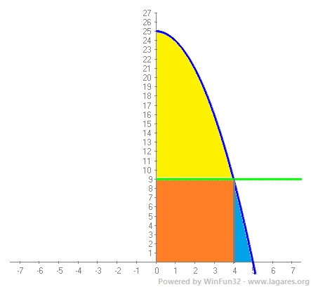 Àrea `=9·4=36` `m^2` 2-2-(Àrea blau marí) Ara falta calcular l'àrea de l'últim tros de la paràbola que és la que queda sota, `f(x) = –x^2 + 25` per sobre de, `y=0` entre `x=4` i `x=5`. `\int_4^5 (–x^2 + 25) dx = [-x^3/3+25x]_4^5=(-5^3/3+25·5)-(-4^3/3+25·4)=-125/3+125+64/3-100=25-61/3=75/3-61/3=14/3` `m^2` Per calcular el cost de la segona regió cal sumar les dues àrees i multiplicar-les pel seu preu. Preu segona àrea `=(36+14/3)*70 = 2846,666` `€` Si sumen les dues quantitats tindrem el preu total `= 2133,333+2846,666 = 4980` `€` |