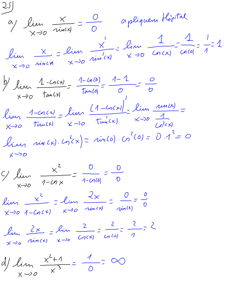 `\lim_{x\to 0} 2xln(1-cosx)` `\lim_{x\to 0} ln(1-cosx)/(1/(2x))=\infty/\infty` `\lim_{x\to 0} ((ln(1-cosx))')/((1/(2x))')` `\lim_{x\to 0} (sinx/(1-cosx))/(-1/(2x^2))` `\lim_{x\to 0} (-2x^2sinx)/(1-cosx)=0/0` `\lim_{x\to 0} ((-2x^2sinx)')/((1-cosx)')` `\lim_{x\to 0} (-4xsinx-2x^2cosx)/sinx=0/0` `\lim_{x\to 0} ((-4xsinx-2x^2cosx)')/((sinx)')` `\lim_{x\to 0} (-4(sinx+xcosx)-2(2xcosx+x^2(-sinx)))/(cosx)` `\lim_{x\to 0} (-4sinx-4xcosx-4xcosx+2x^2sinx)/(cosx)` `\lim_{x\to 0} (-4sinx-8xcosx+2x^2sinx)/(cosx)=0/1=0` `\lim_{x\to 0} ln(1-cosx)^(2x)=0` `e^(\lim_{x\to 0} ln(1-cosx)^(2x))=e^0` `e^(\lim_{x\to 0} ln(1-cosx)^(2x))=e^0` `\lim_{x\to 0} e^(ln(1-cosx)^(2x))=1` `\lim_{x\to 0} (1-cosx)^(2x)=1` b- `\lim_{x\to \pi/2} (sinx)^tanx` c- `\lim_{x\to 0} (e^x-e^(-3x))/ln(1+x)` d- `\lim_{x\to 0} x^4lnx` SOLUCIÓ: