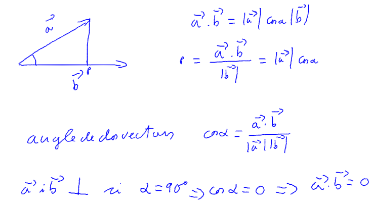 Projecció d'un vector sobre un altre. Angle entre dos vectors. Dos vectors són perpendiculars si el seu producte escalar val 0.