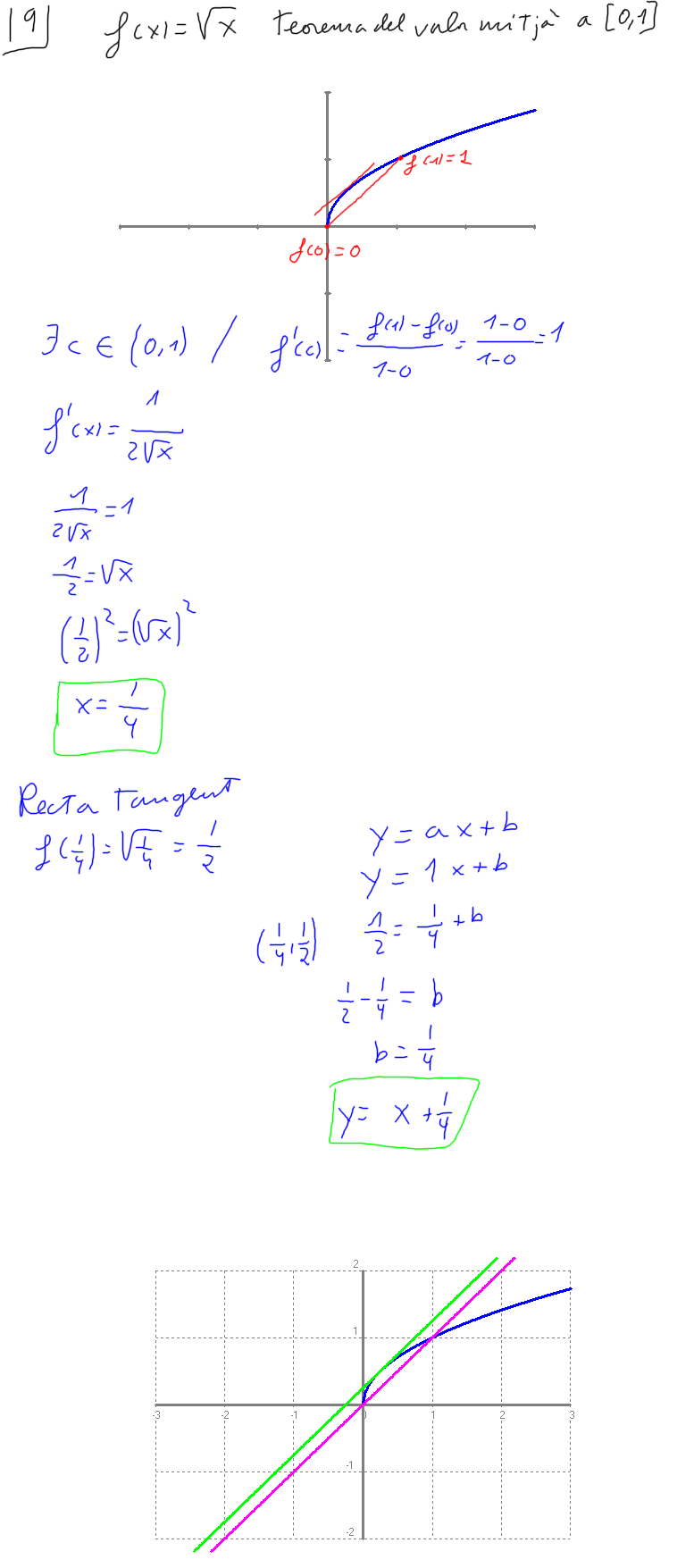 Exercicis apliacació del Teorema del valor mitjà 1-Demostra que a la funció f(x) = x1/2 (arrel quadrada de x) se li pot aplicar el teorema del valor mitjà a l'interval [0, 1]. Calcula el punt c de l'interval tal que f'(c) = 1. Troba l'equació de la recta tangent a la corba en aquest punt.