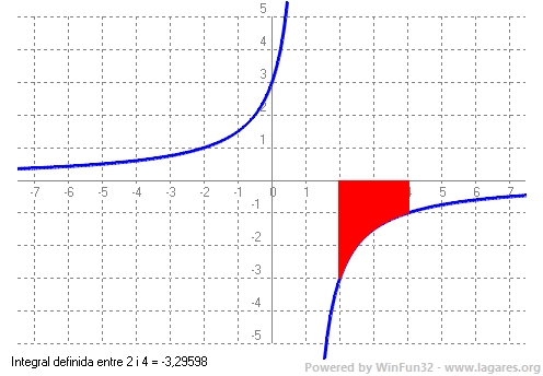 c) `\int_2^4 3/(1-x) dx=[-3ln|1-x|]_2^4=-3[ln(3)-ln(1)]=-3ln(3)`