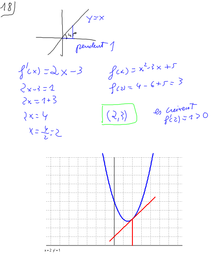 Creixement, decreixement, màxims i mínims relatius 1-Considera la funció f(x) = x2 -3x +5 i digues en quin punt de la seva gràfica la recta tangent forma un angle de 45º amb l'eix X. En aquest punt aquesta funció és creixent o decreixent?
