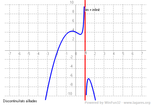 2-(2019-juny-1-4) Considereu la funció `f(x)=(2x^3-5x+4)/(1-x)`. a) Calculeu-ne el domini i estudieu-ne la continuïtat. Té cap asímptota vertical? b) Observeu que , `f(0) = 4` i `f(2) = -10`. Raoneu si, a partir d'aquesta informació, podem deduir que l'interval `(-2, 0)` conté un zero de la funció. Podem deduir-ho per a l'interval `(0, 2)`? Trobeu un interval determinat per dos enters consecutius que contingui, com a mínim, un zero d'aquesta funció. a) És un quocient de polinomis el domini són tots els Reals excepte on el denomunador sigui `0` i això passa per `x=1`. La qual cosa `=>` que la funció és contínua per tots els `x` del seu domini (`R-{1}`) `\lim_{x\to 1}(2x^3-5x+4)/(1-x)=1/0=\infty =>` la funció té una asímptota vertical `x=1` b) No ho podem deduir (Teorema de Bolzano) ja que tot i que les imatges tenen diferent signe com la funció no és contínua a l'interval `(0,2)` `f(-2)=(-16+10+4)/3=(-2)/3 => f(-2)·f(0)<0 =>` Hi ha un zero de la funció a l'interval `(-2,0)` Per trobar un interval determinat per dos enters consecutius el que farem és calcular la imatge de `x=-1` `f(-1)=(-2+5+4)/2=7/2>0`. O sigui el zero es trobarà a l'interval `(-2,-1)` No ho demana l'exercici, però per ajudar a la comprensió aquí teniu el dibuix de la gràfica: ![]() |