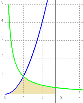 3-(2019-juny-1-6) Considereu les funcions `f(x) = x^2` i `g(x)=1/x`, i la recta `x = e`. a) Feu un esbós de la regió delimitada per les seves gràfiques i l'eix de les abscisses. Calculeu les coordenades del punt de tall de `y = f(x)` amb `y = g(x)`. b) Calculeu l'àrea de la regió descrita en l'apartat anterior. a) ![]() `x^2=1/x => x^3=1 =>x=1 => (1,1)` b) Cal calcular l'àrea entre `0` i `1` fent la integral definida de la funció `x^2` i la integral definida entre `1` i `e` de la funció `1/x`. `\int_0^1x^2dx+\int_1^e1/xdx=[x^3/3]_0^1+[lnx]_1^e=1/3+lne-ln1=1/3+1=4/3 u^2` |