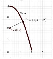 `d(sqrt(3/2))=sqrt(sqrt(3/2)^4-3sqrt(3/2)^2+4)=sqrt(9/4-9/2+4)=sqrt(9/4-18/4+16/4)=sqrt(7/4)=sqrt(7)/2 \approx 1,32` Que és més petit que `d(0)=2`. Calculem la distància en el punt de tall amb l'eix d'abscises `4-x^2=0 => x=2`