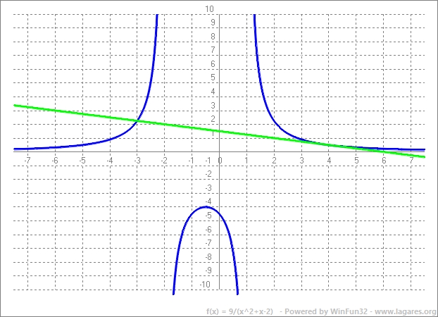 `x^2+x-2=0 => x=(-1 pm \sqrt{(-1)^2-4·1·(-2)})/2=(-1 pm \sqrt{9})/2=(-1 pm 3)/2 => x_1=1` i `x_2=-2` Que precisament aquests dos valors de les `x` són possibles candidats a haver-hi asimptotes verticals. `\lim_{x\to 1} 9/(x^2+x-2)=9/0= infty` `\lim_{x\to -2} 9/(x^2+x-2)=9/0= infty` Per trobar, si n'hi ha, les asímptotes hortitzontals cal calcular: `\lim_{x\to pm infty}9/(x^2+x-2)=0` ja que el grau del polinomi de dalt, `0` `<` que el grau del polinomi de baix, `2`. Com hi ha asímptota horitzontal tan cap a `pm infty` non'hi ha d'oblíqües. Per trobar els possibles extrems relatius caldrà calcular la derivada i igualar-la a `0`. `f'(x)= (-9(2x+1))/(x^2+x-2)^2=0 => 2x+1=0 => x=-1/2`. `f(1/2)=9/((-1/2)^2-1/2-2) = -4` Per saber si és un màxim o un mínim cercarem `f'(-1)` i `f'(0)` a l'esquerra i dreta del candidat a ser extrem `x=-1/2`.