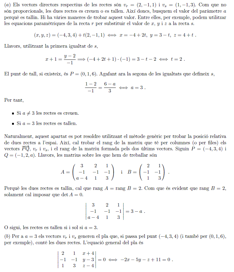 a) Trobeu el valor del paràmetre a perquè aquestes rectes es tallin. b) En el cas en què es tallen, trobeu l'equació general (és a dir, de la forma Ax + By + Cz + D = 0) del pla que les conté. [1,5 punts per l'apartat a; 0,5 punts per l'apartat b]