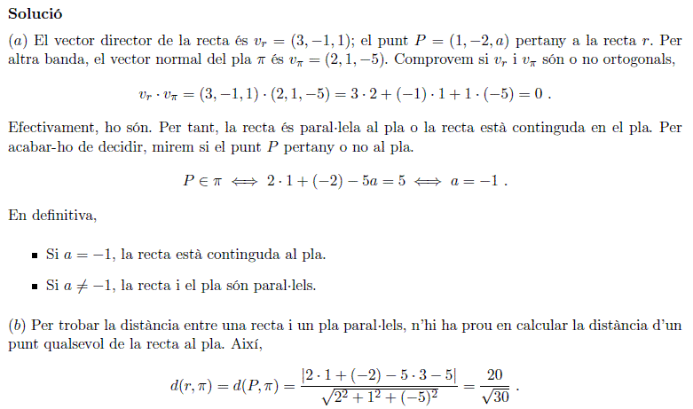 b) Quan a = 3, calculeu la distŕncia de la recta r al pla π.