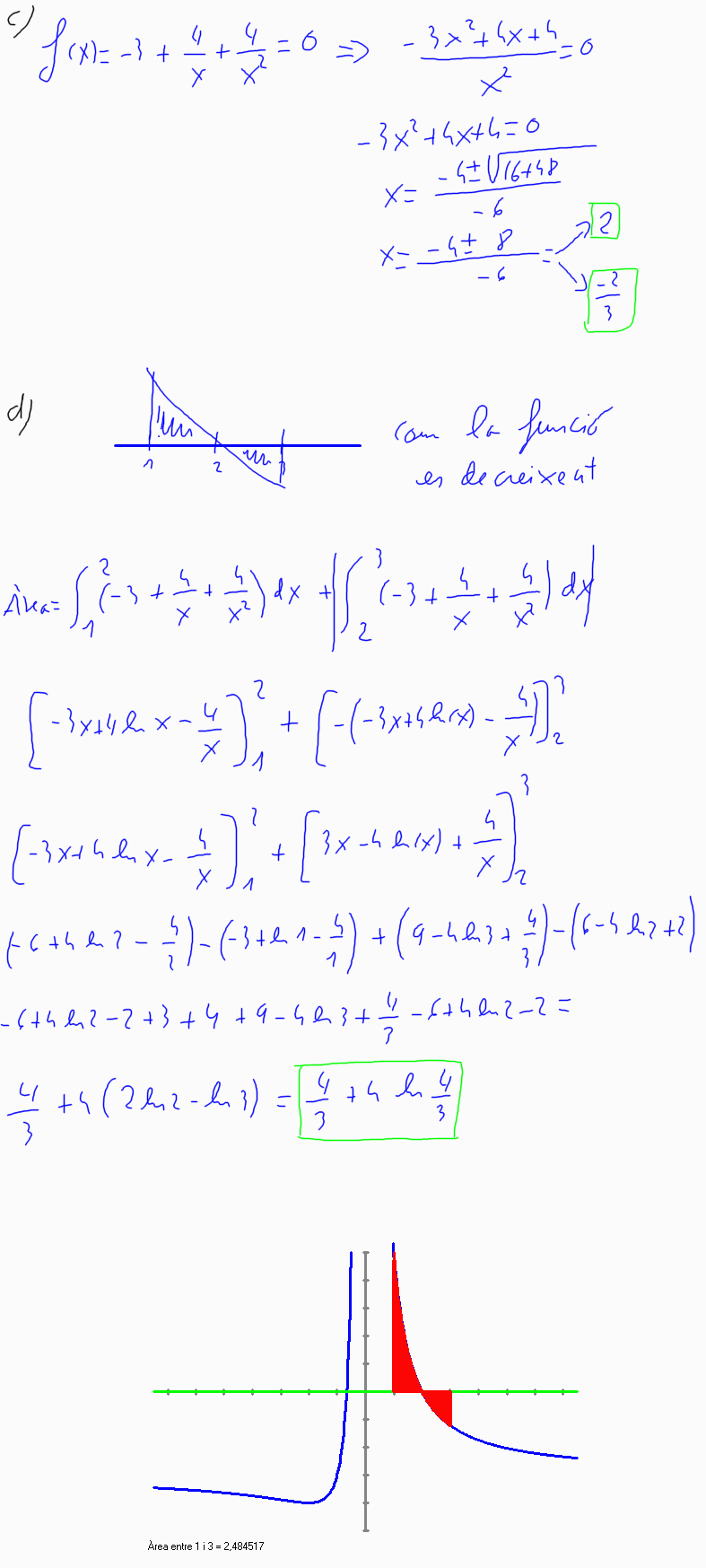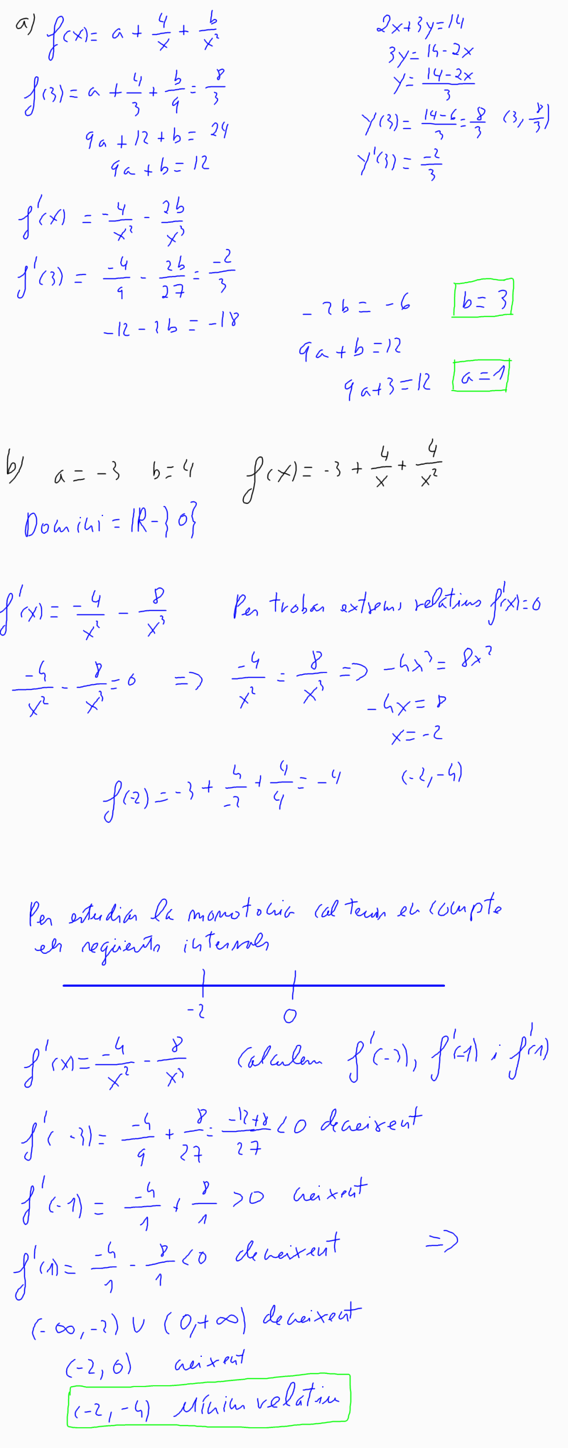4. (2009-juny-3) 5. Sigui la funció a) Calculeu els valors de a i b, sabent que la recta 2x + 3y = 14 és tangent a la grŕfica de la funció f (x) en el punt d'abscissa x = 3. Per a la resta d'apartats, considereu que a = -3 i que b = 4. b) Trobeu els intervals de creixement i de decreixement de la funció f (x). Trobeu i classifiqueu els extrems relatius que té la funció. c) Calculeu els punts de tall de la funció f (x) amb l'eix OX. d) Trobeu l'ŕrea del recinte limitat per la grŕfica de la funció f (x), l'eix OX i les rectes x = 1 i x = 3. [1 punt per l'apartat a; 1 punt per l'apartat b; 0,5 punts per l'apartat c; 1,5 punts per l'apartat d ]