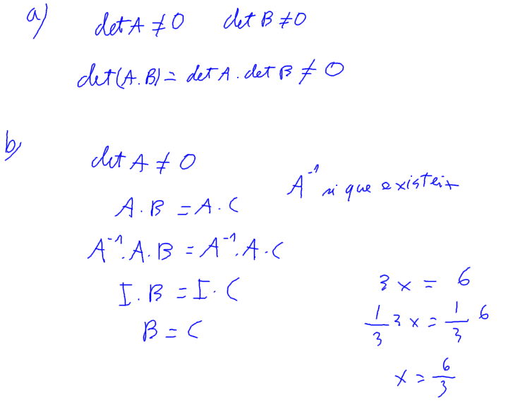 6. (2010-juny-5) 4. Siguin A, B i C matrius quadrades d'ordre n. a) Expliqueu raonadament si és possible que det A ≠ 0, det B ≠ 0 i det (A ˇ B) = 0. Si és possible, poseu-ne un exemple. b) Si sabem que det A ≠ 0 i que A ˇ B = A ˇ C, expliqueu raonadament si podem assegurar que B = C. [1 punt per cada apartat]