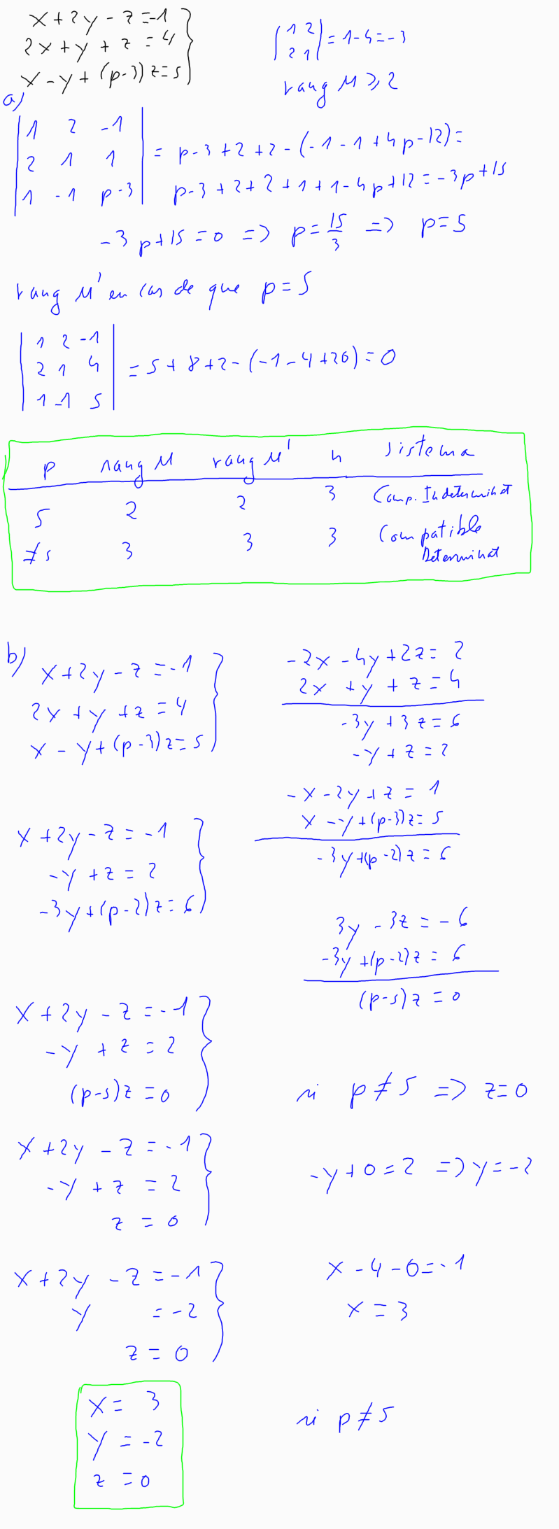 4. (2010-juny-1) 2. Donat el sistema d'equacions lineals a) Estudieu-ne el caràcter (és a dir, si és compatible o no i si és determinat o no) en funció del paràmetre p. b) Comproveu que si p ≠ 5 la solució del sistema no depèn del valor d'aquest paràmetre. [1,5 punts per l'apartat a; 0,5 punts per l'apartat b]