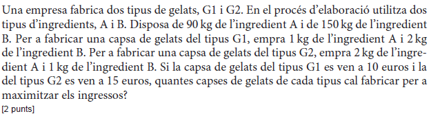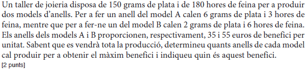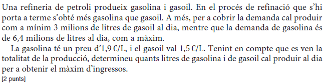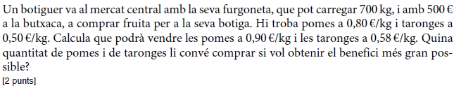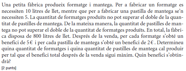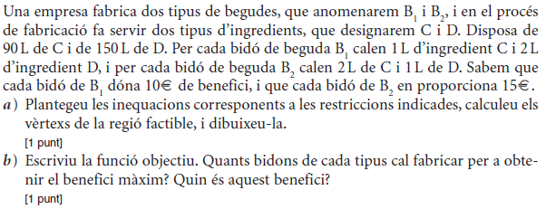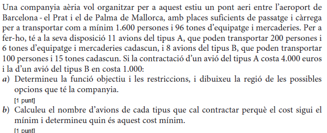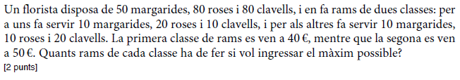 Programació Lineal - Resolució de problemes - 2009 - Setembre - sèrie 1 - 5. ![]() - 2010 - Juny - sèrie 4 - 4. ![]() - 2010 - Juny - sèrie 5 - 3. ![]() - 2011 - Setembre - sèrie 2 - 2. ![]() - 2012 - Setembre - sèrie 4 - 4. ![]() - 2013 - Juny - sèrie 4 - 5. ![]() - 2013 - Setembre - sèrie 1 - 5. ![]() - 2014 - Setembre - sèrie 5 - 5. ![]() - 2015 - Juny - sèrie 2 - 6. ![]() - 2017 - Juny - sèrie 1 - 5. ![]() - 2017 - Juny - sèrie 5 - 1. ![]() - 2017 - Setembre - sèrie 2 - 1. ![]() |
