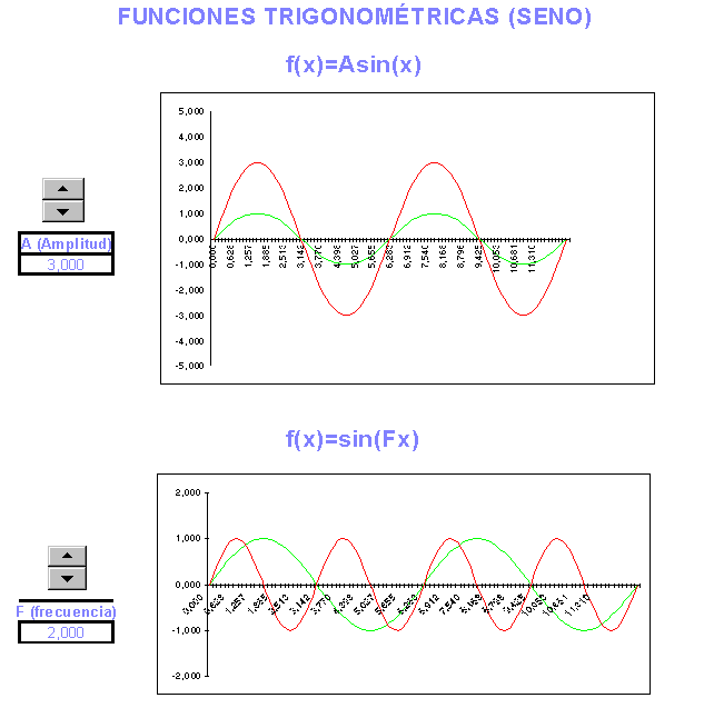 Si escucháramos un sonido con la frecuencia la mitad al sonido que escuchamos anteriormente se oiría 0,5 la fuerte.wav [f(x)=sin(0,5x)]. Para compararlo, el inicial se oiría la fuerte.wav [f(x)=sin(x)] i el otro se oiría 3 la fuerte.wav [f(x)=sin(3x)]. Para practicar un poco más y de una forma más interactiva con las ideas ligadas a la amplitud y la frecuencia (y si se dispone de Excel) haz doble clic y pulsa en los botones para hacer aumentar o disminuir el valor de la amplitud y el valor de la frecuencia y observa como varia la forma de las funciones. La primera gráfica muestra como varia la función seno al variar la amplitud (función roja, en verde se muestra la función seno(x) normal. La segunda gráfica muestra como varia la función seno al variar la frecuencia. Práctica 3 – Para realizar esta práctica es necesario disponer de la hoja de cálculo, Microsoft Excel 97. Pulsando los botones podemos modificar interactivamente la amplitud de una función seno y la frecuencia de la otra función seno: