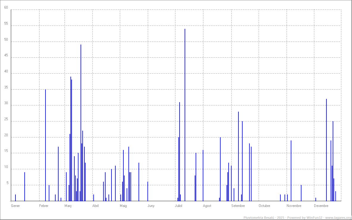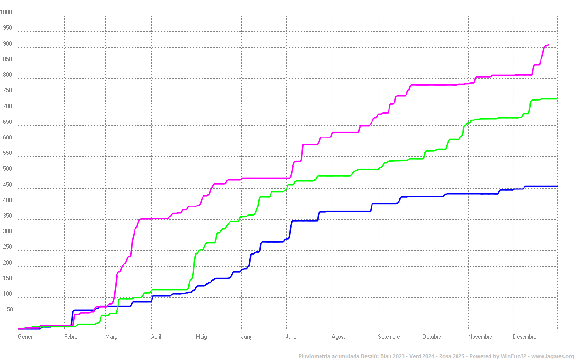 Pluviometria acumulada Besalu - 2023 (456 l/m²), 2024 (736 l/m²), 2025 (907 l/m² - 25/12/25)