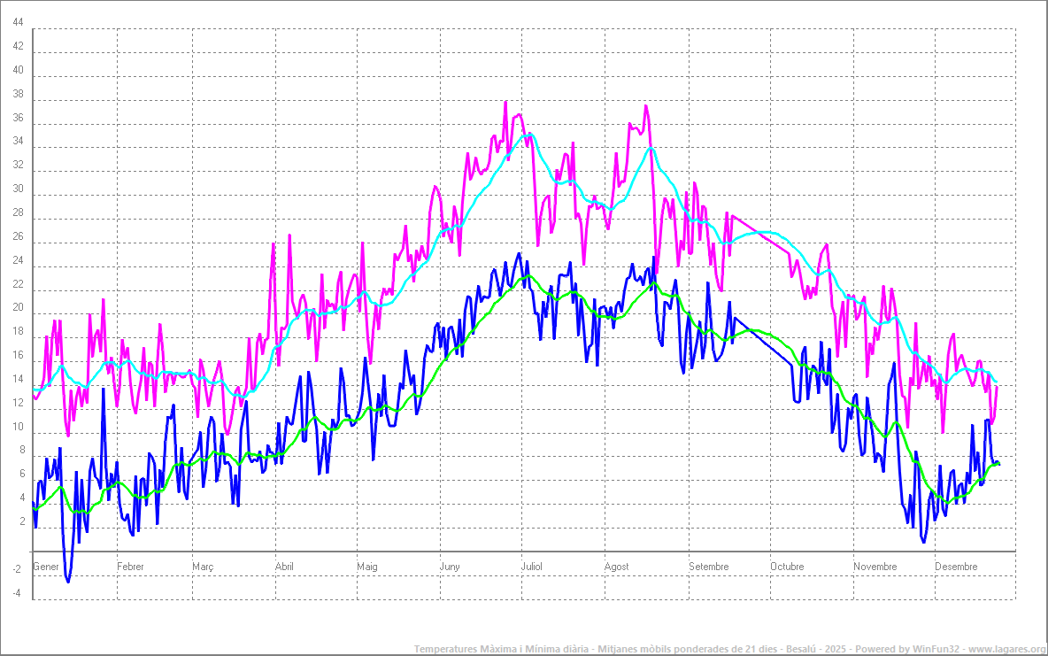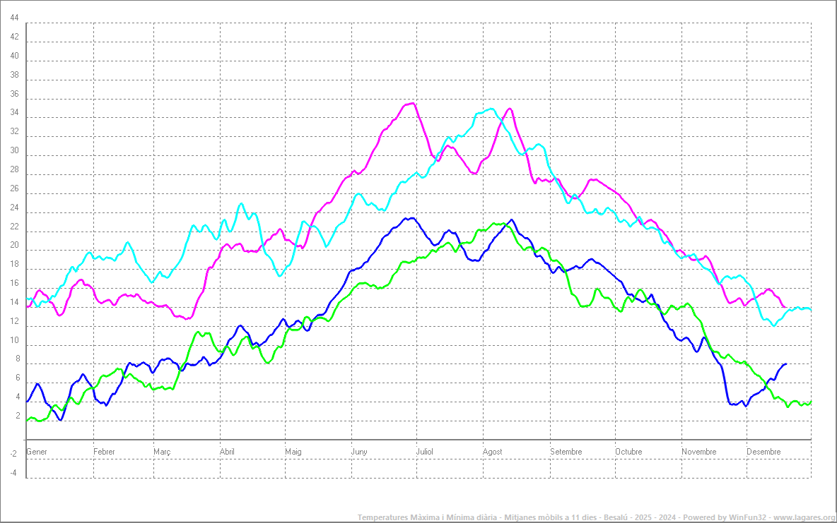 Mitjana mòbil 11 dies - Temperatures Besalu (Màx i Mín) - 2024, 2025